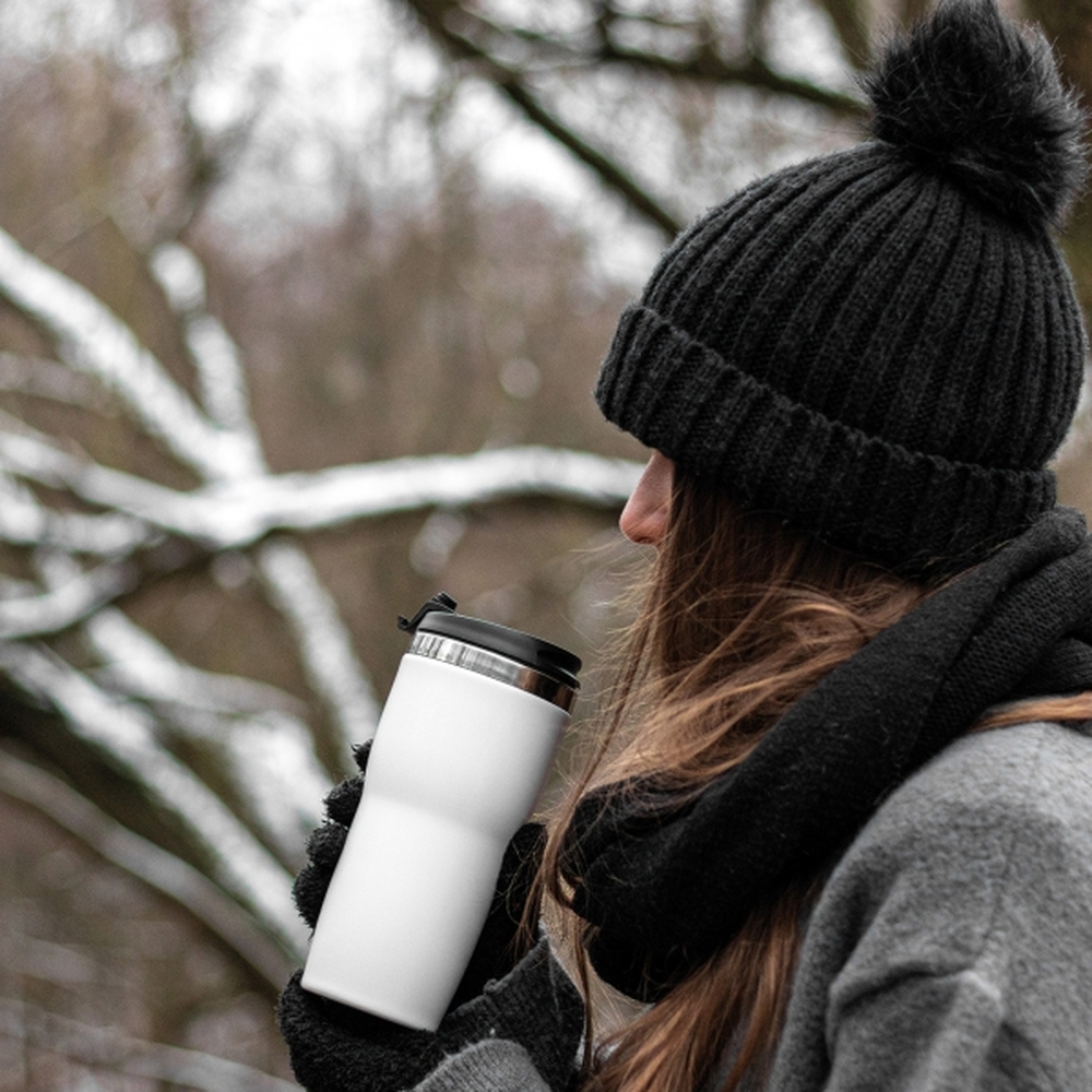 Thermo drinking mug with white stainless steel casing and a capacity of 400 ml.
