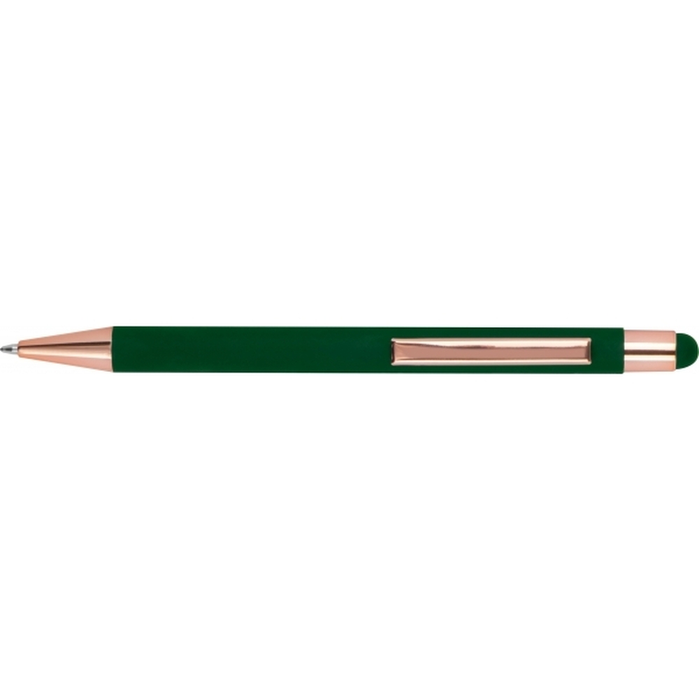 Ballpoint pen made of aluminum with a rubber finish surface, rose gold accents, and a touch pen. It is equipped with a blue-writing large-capacity plastic refill. Color of engravering: silver