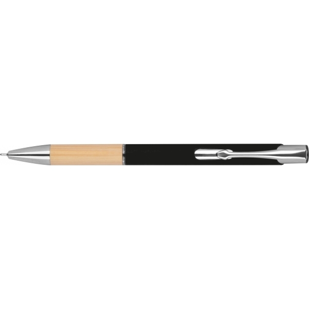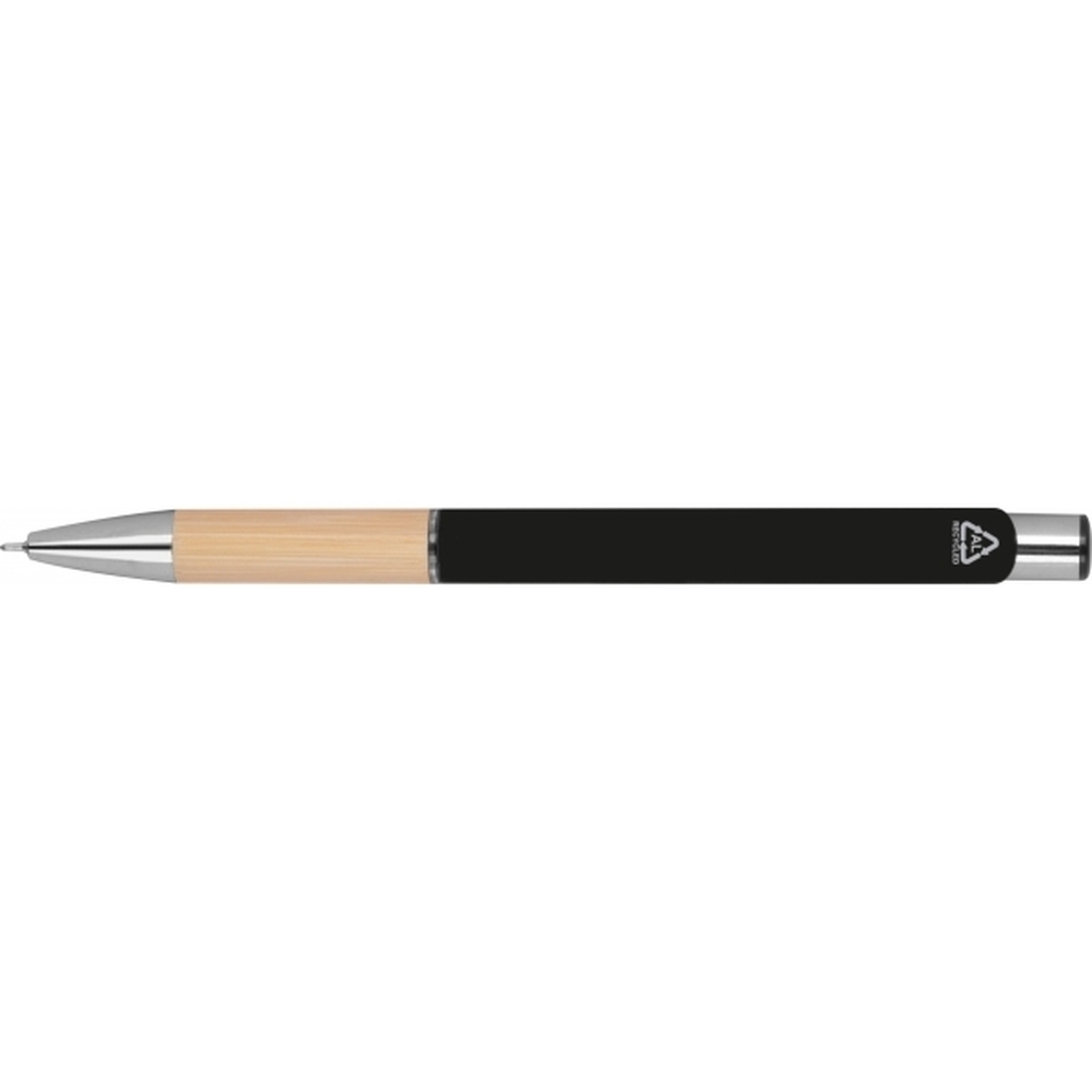 Semi gel pen made from recycled aluminum with a rubber finish surface. It also features a bamboo grip zone, a blue-writing plastic refill (0.5mm tip), and silver accents.
