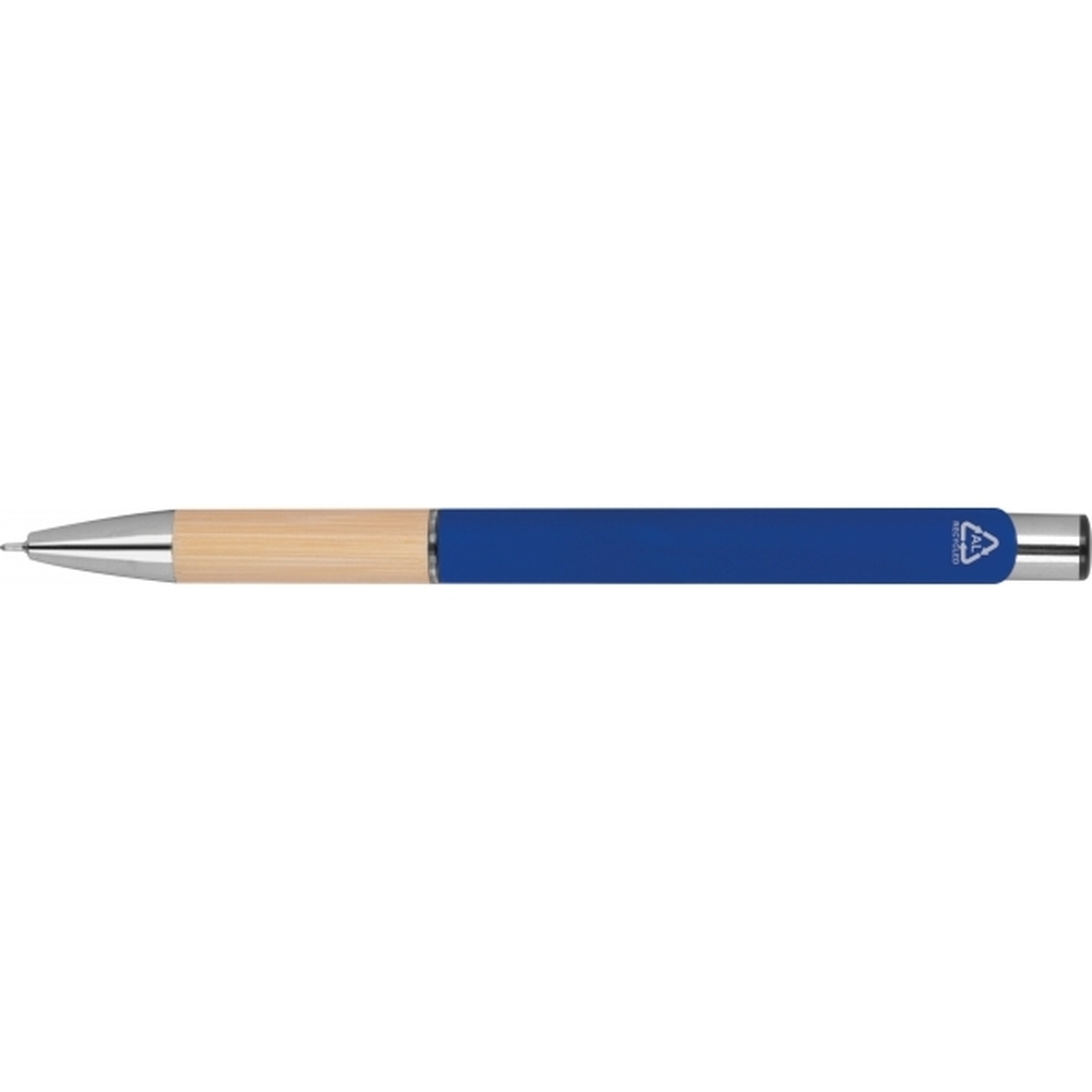 Semi gel pen made from recycled aluminum with a rubber finish surface. It also features a bamboo grip zone, a blue-writing plastic refill (0.5mm tip), and silver accents.