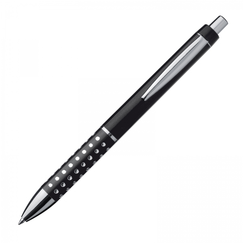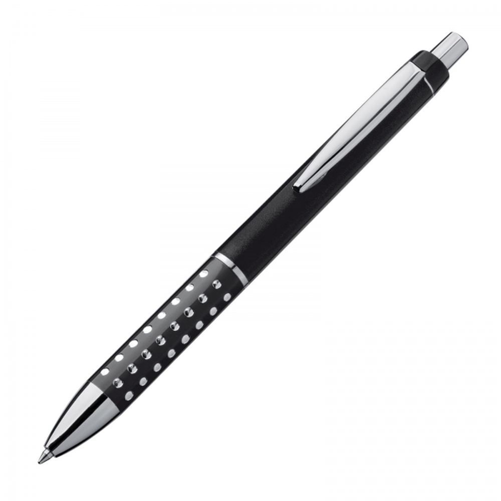 Kugelschreiber aus Kunststoff mit glitzernder, rutschfester Griffzone und blau schreibender Großraummine. Ihre Werbung drucken wir auf den Schaft.