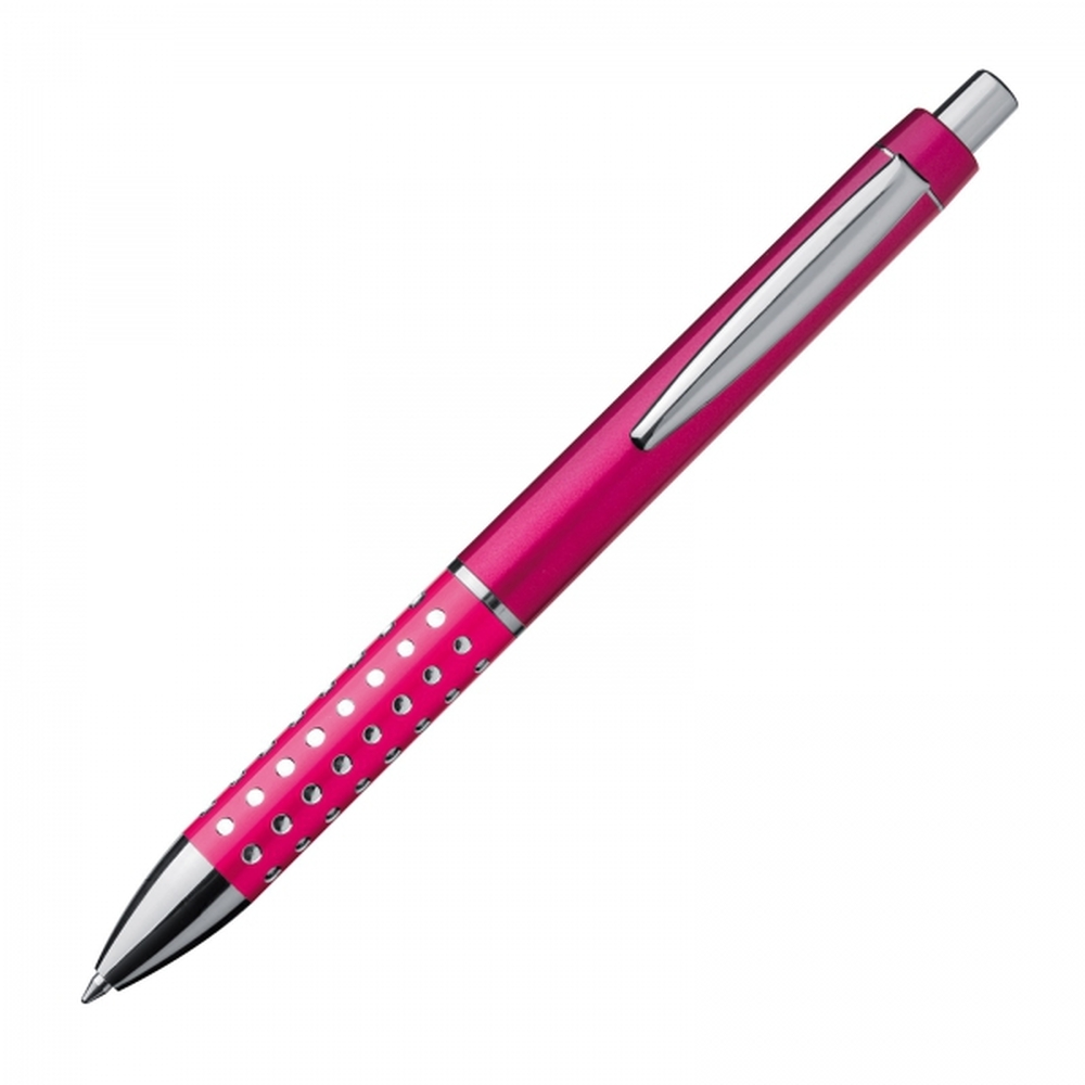 Kugelschreiber aus Kunststoff mit glitzernder, rutschfester Griffzone und blau schreibender Großraummine. Ihre Werbung drucken wir auf den Schaft.