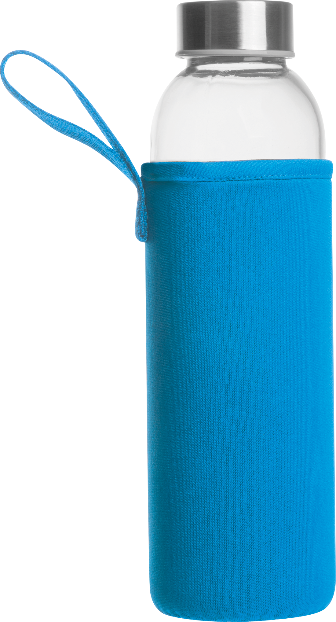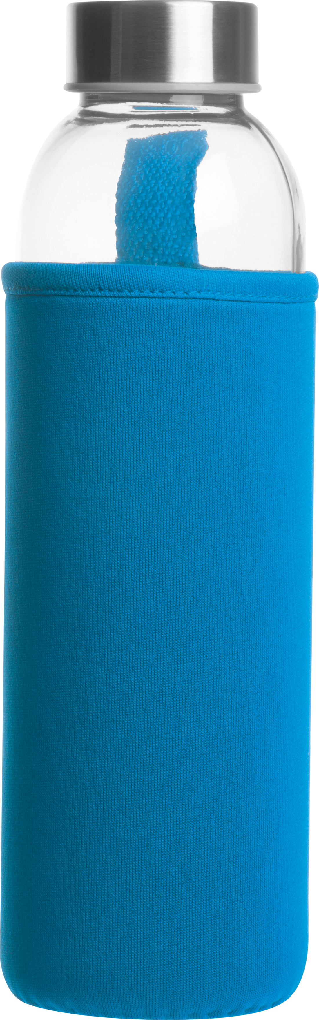 Leak-proof drinking bottle made of glass with stainless steel lid and a capacity of 500 ml. The bottle is delivered in a matching neoprene sleeve with carrying strap. We print your logo in the center of the sleeve. Engraving on the lid or bottle and printing on the bottle possible on request.