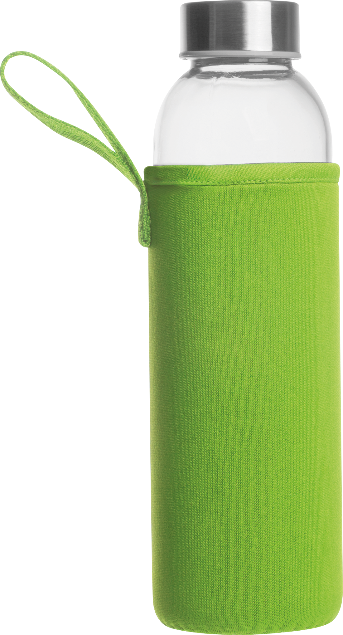 Leak-proof drinking bottle made of glass with stainless steel lid and a capacity of 500 ml. The bottle is delivered in a matching neoprene sleeve with carrying strap. We print your logo in the center of the sleeve. Engraving on the lid or bottle and printing on the bottle possible on request.