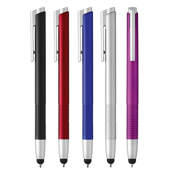 Plastic ballpoint pen, touch. Blue writing, pulsar system. In this ballpoint pen you can find silver details allied to a colored body with a touch of texture. Touch included.