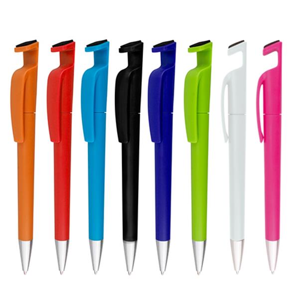 Plastic Ballpoint Pen, 3 in 1, Stand. Blue writing, twist system. Customers are increasingly looking for a complete gift, with multifunctionality. In this ballpoint pen you will find the writing function, but also a support for your mobile phone and, at the top, I include a screen cleaner. With silver detail, a functional ballpoint pen tailored to the most demanding choice.