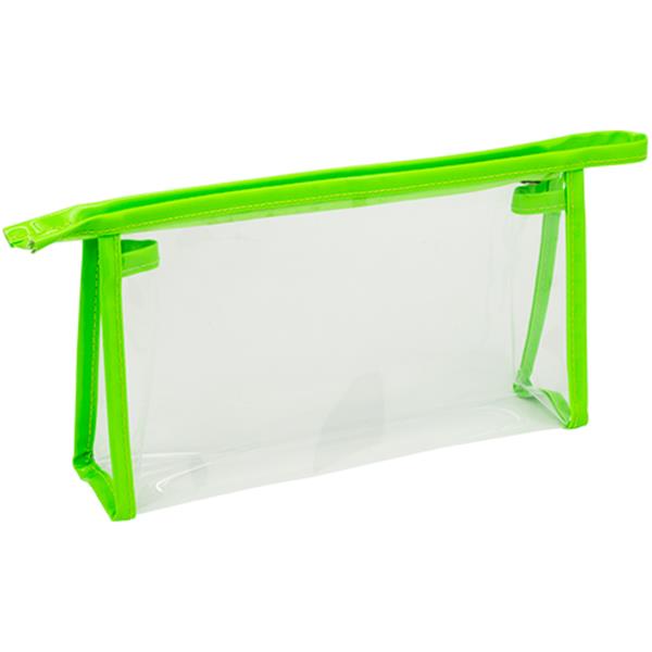 Clear PVC toiletry bag with neon details. With vibrant and eye-catching colors on the clasp and edges. Thanks to its transparency, it becomes adapted to travel with you on your plane trips. Good customization area.