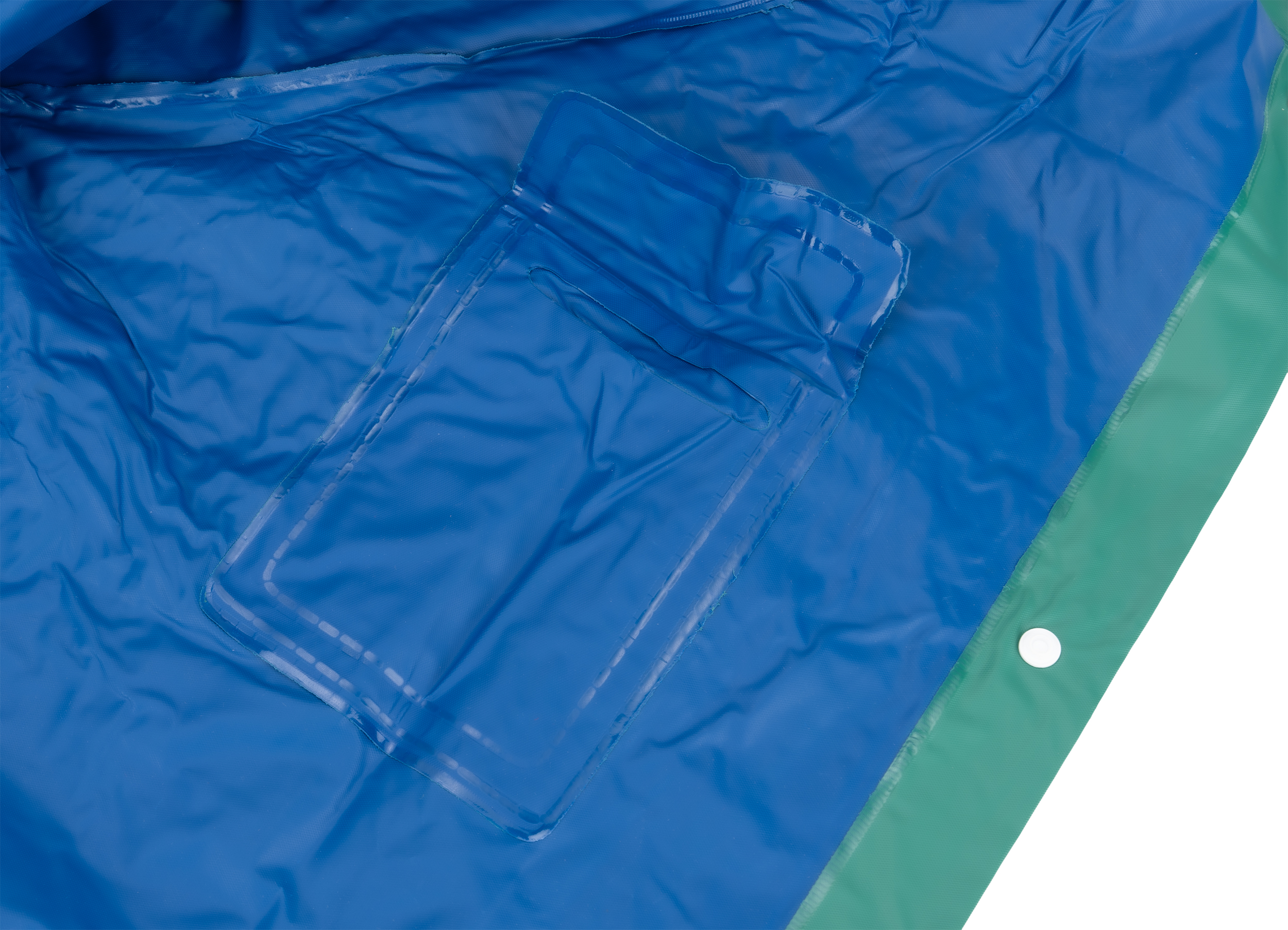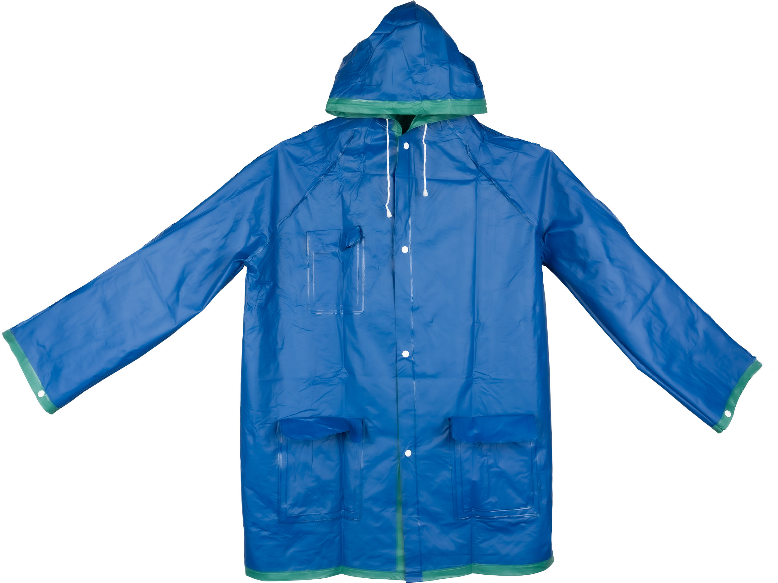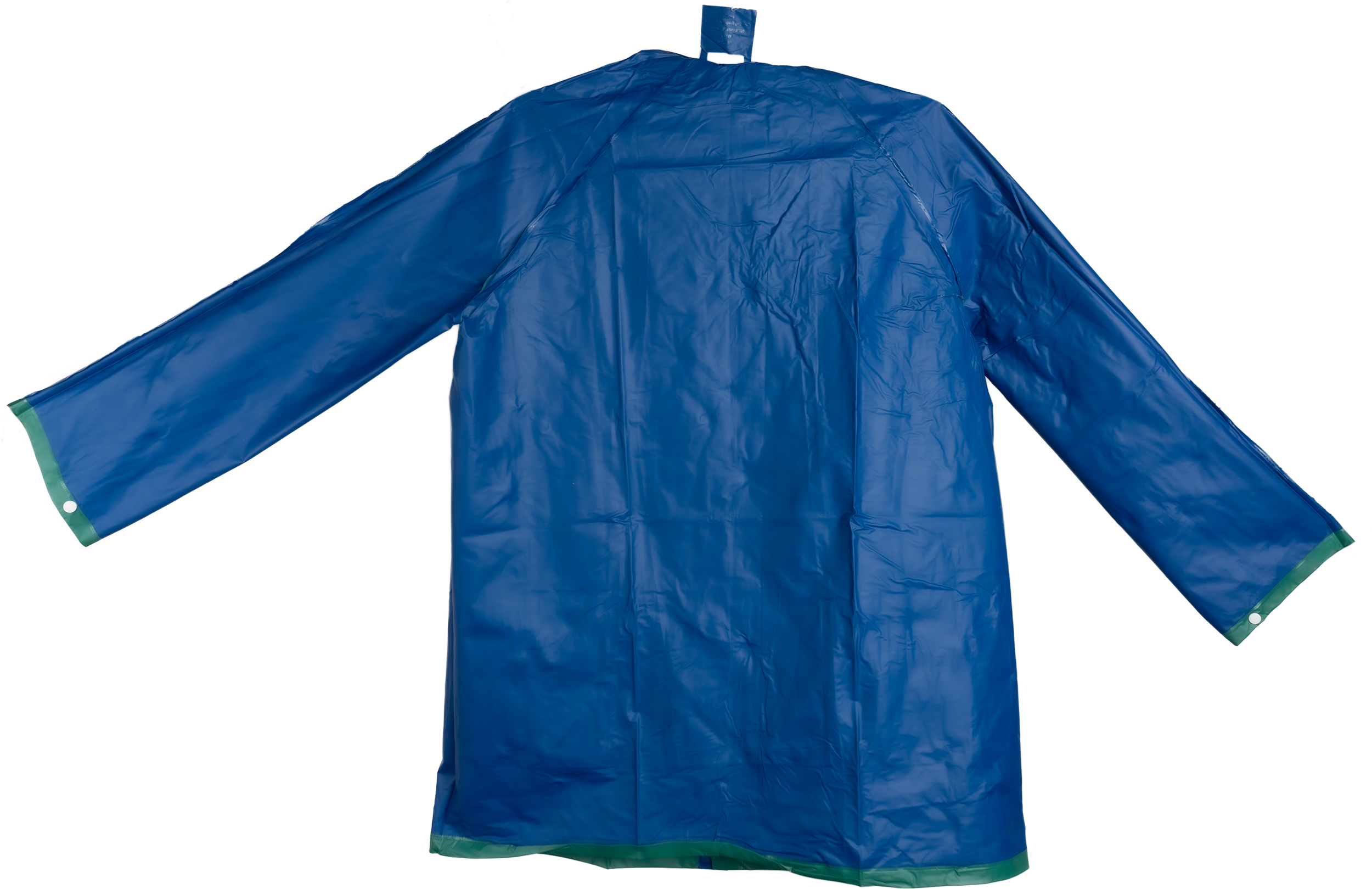 Reversible PVC rain jacket with hood, two pockets and press studs. Back of the coat - 103 x 60 cm.