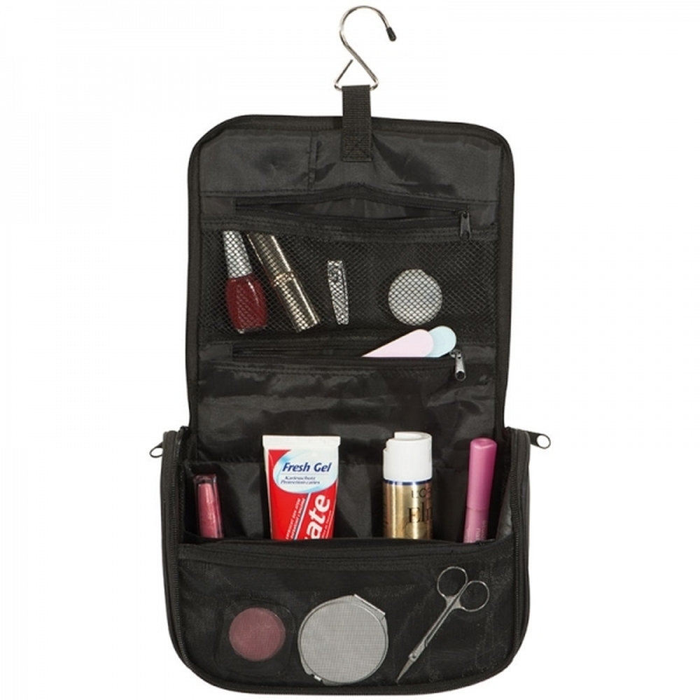 190T nylon toilet bag with a large inner compartment, 3 zipped compartments, 4 elastic bands, and hanging hook. We print your logo on the front.