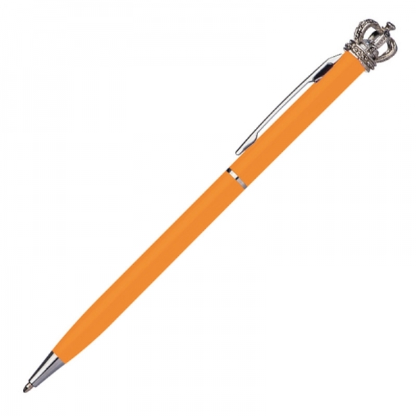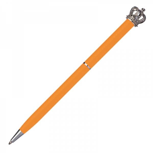 Slim ballpen made of metal with blue writing refill. The crown and the small glass diamond make this pen unique. We engrave your logo to the right of the clip.