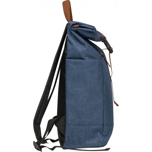 Backpack made of 500D polyester with foldable or rollable closure, padded straps, carrying handle and lockable front compartment. Your logo will be printed on the front compartment.