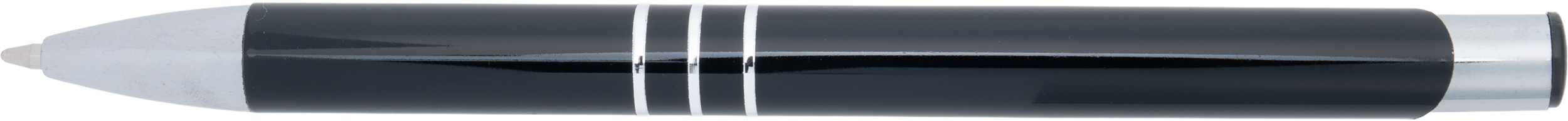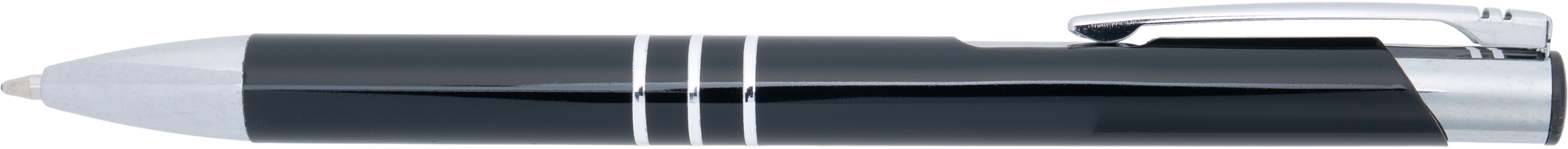 Fully lacquered metal ballpen with 3 decorative rings and blue-writing refill with large capacity. Your logo will be engraved to the right of the clip.