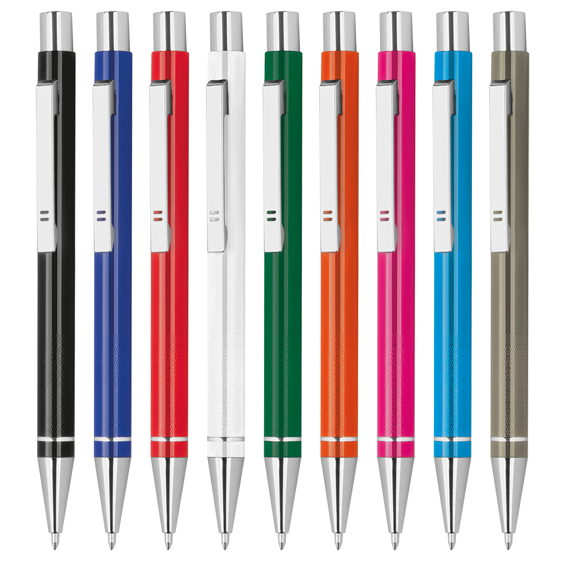 Metal ball pen made of aluminium with blue semi-gel refill (1 mm tip) and ribbed grip zone. We laser your logo to the right side of the clip.