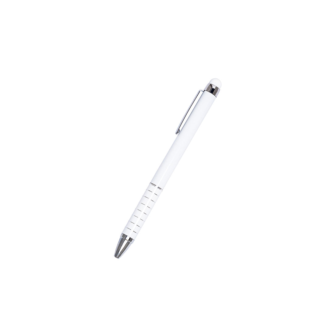 Twist ball metal pen with touch function and blue writing refill. 8 engraved rings makes the writing zone convenient. Your logo will be laser engraved below the clip.