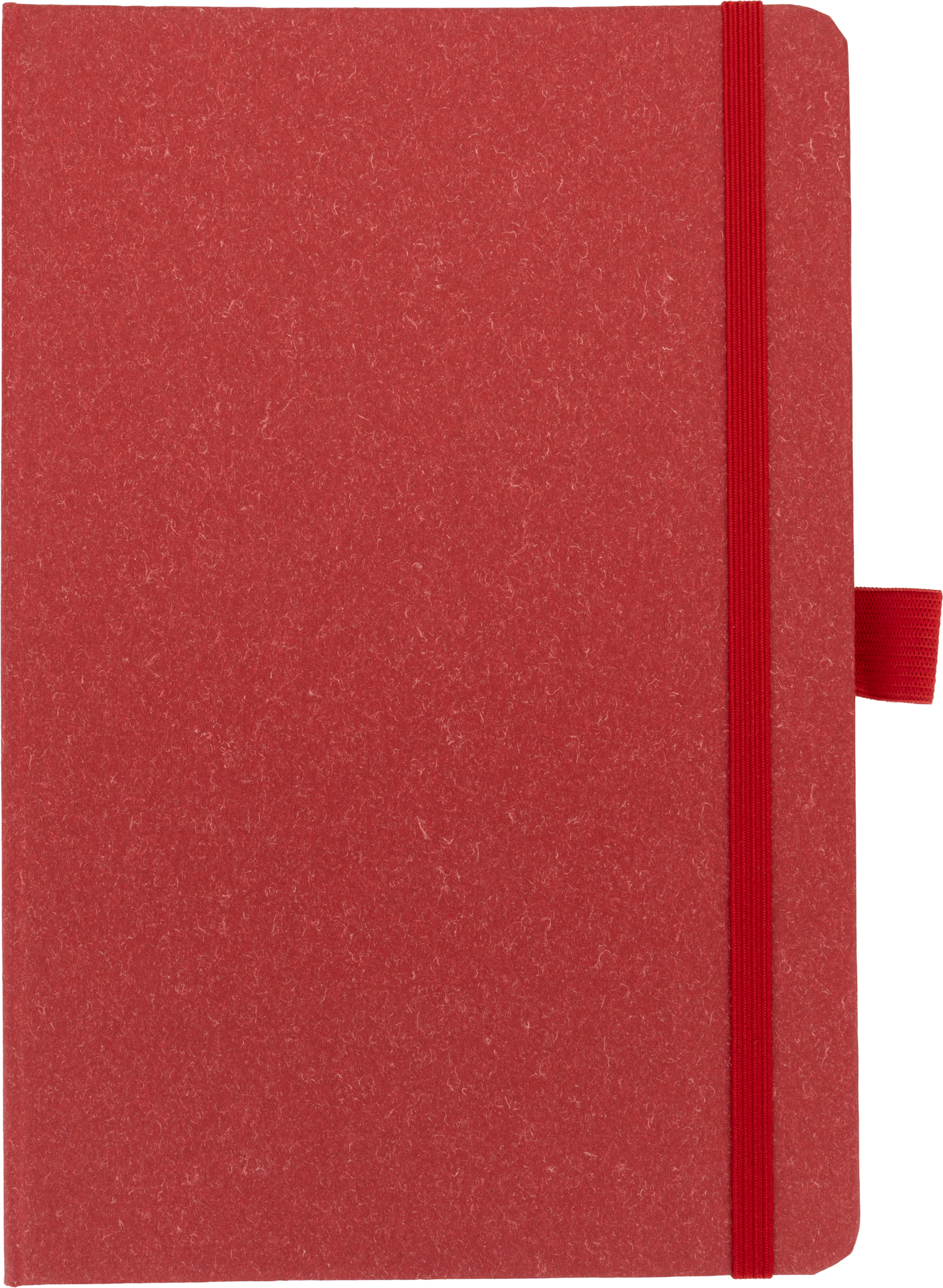 A5 notebook with a recycled cardboard cover, a bookmark, 160 dotted pages made of recycled paper and an elastic band for closure.