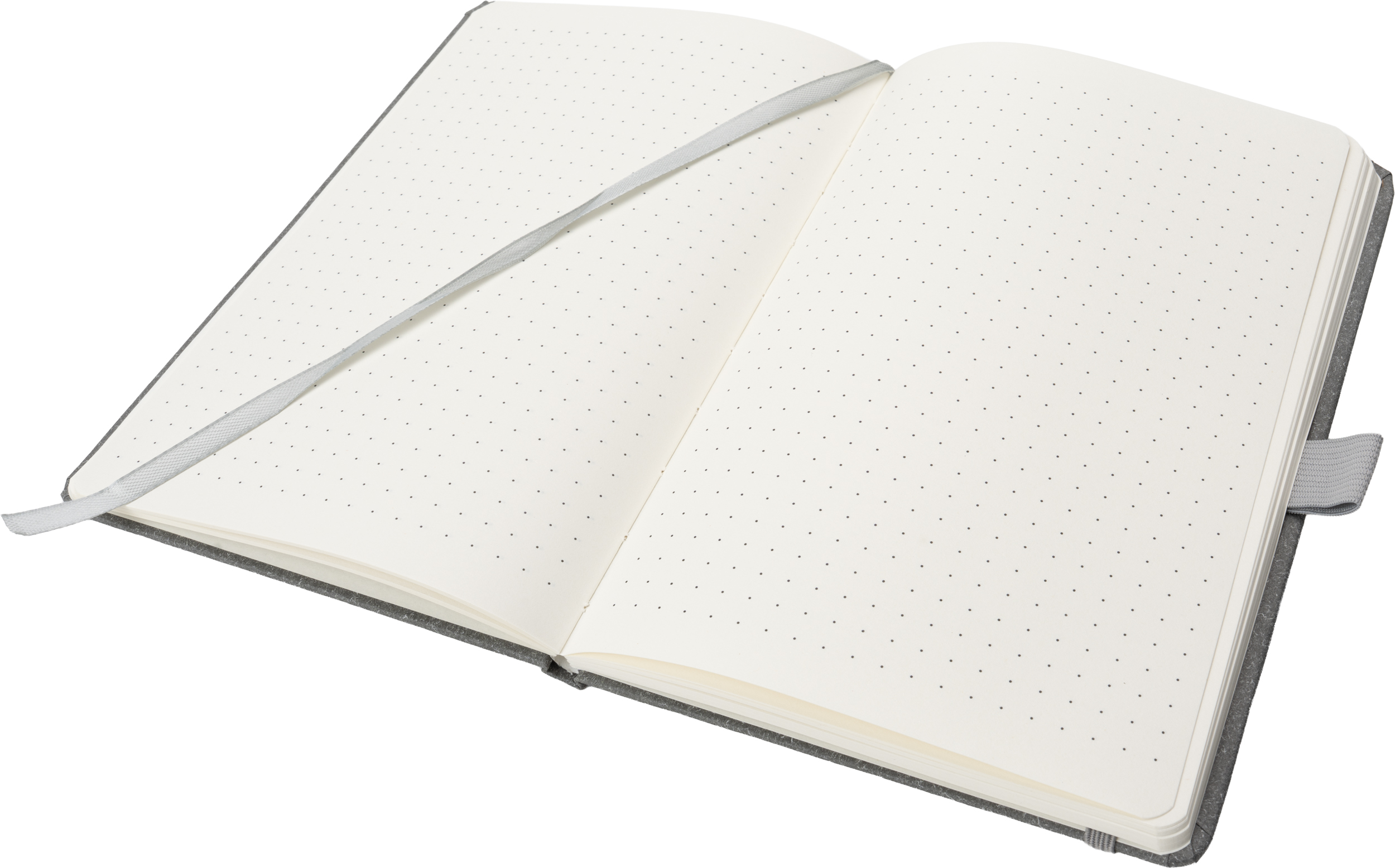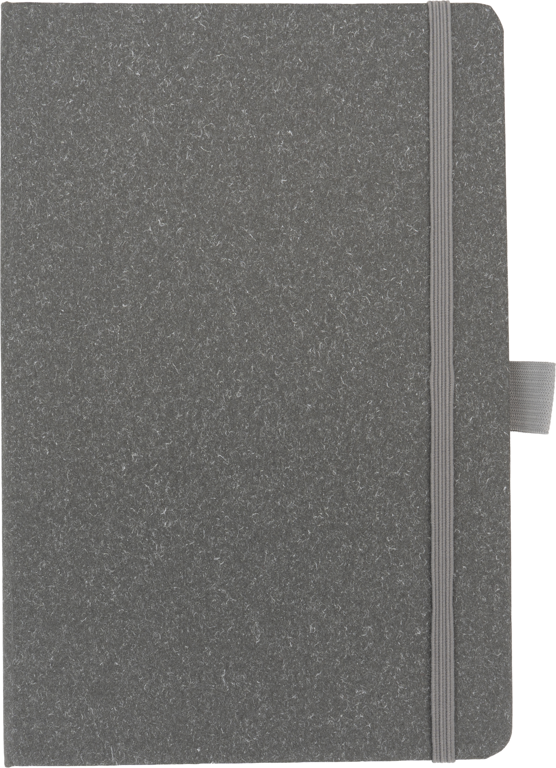 A5 notebook with a recycled cardboard cover, a bookmark, 160 dotted pages made of recycled paper and an elastic band for closure.