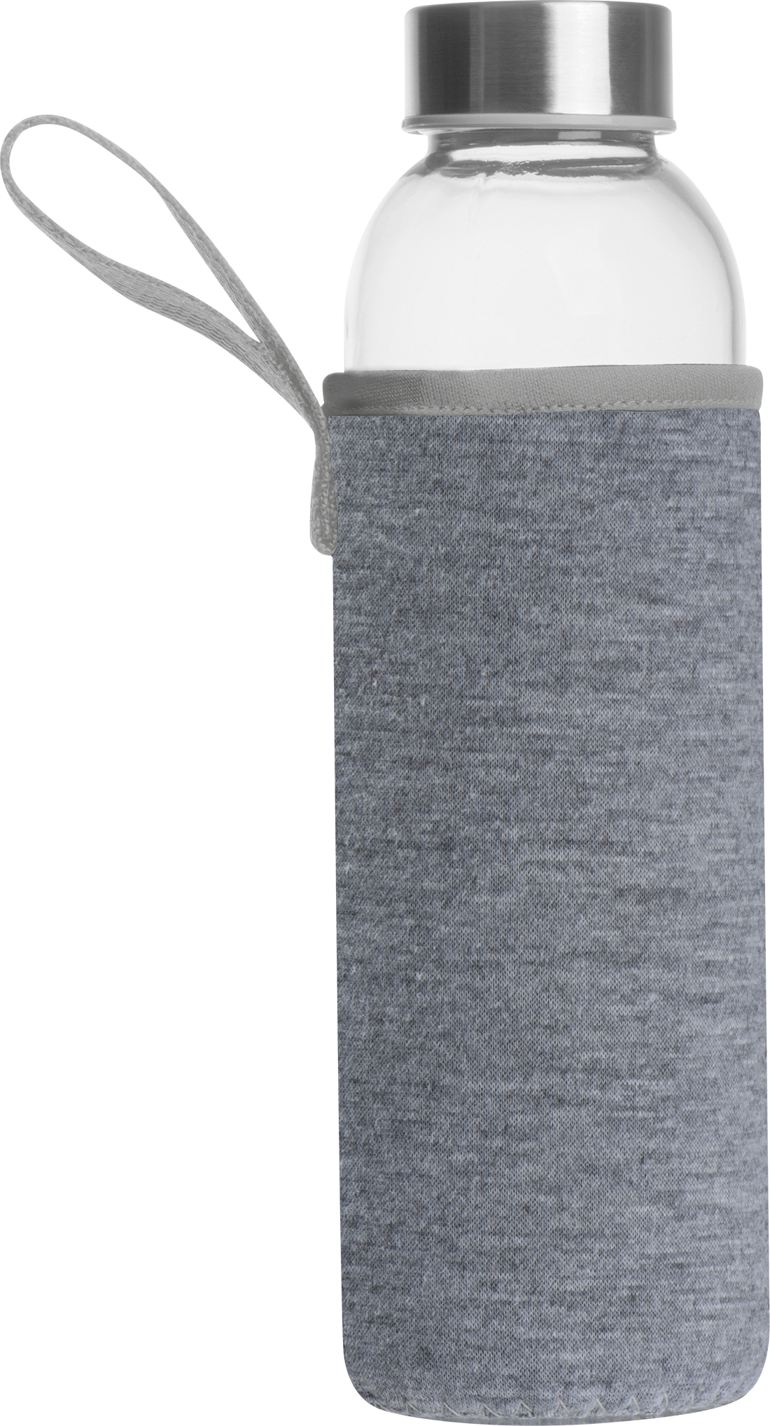 Leak-proof drinking bottle made of glass with stainless steel lid and a capacity of 500 ml. The bottle is delivered in a matching neoprene sleeve with carrying strap. We print your logo in the center of the sleeve. Engraving on the lid or bottle and printing on the bottle possible on request.