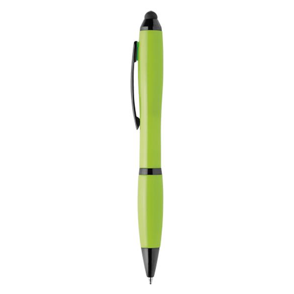 Plastic ballpoint pen, touch and metal clip. Black writing, twist system. With black details and black metallic clip. Styluds included