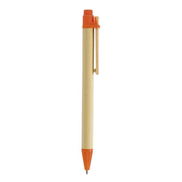 Recycled cardboard ballpoint pen, wooden clip. Black writing, pulsar system. Ballpoint pen with recycled cardboard body, light wood clip and colored plastic top and nib. With this gift you can associate your brand with the ecological movement. Choose recycled, save the planet!