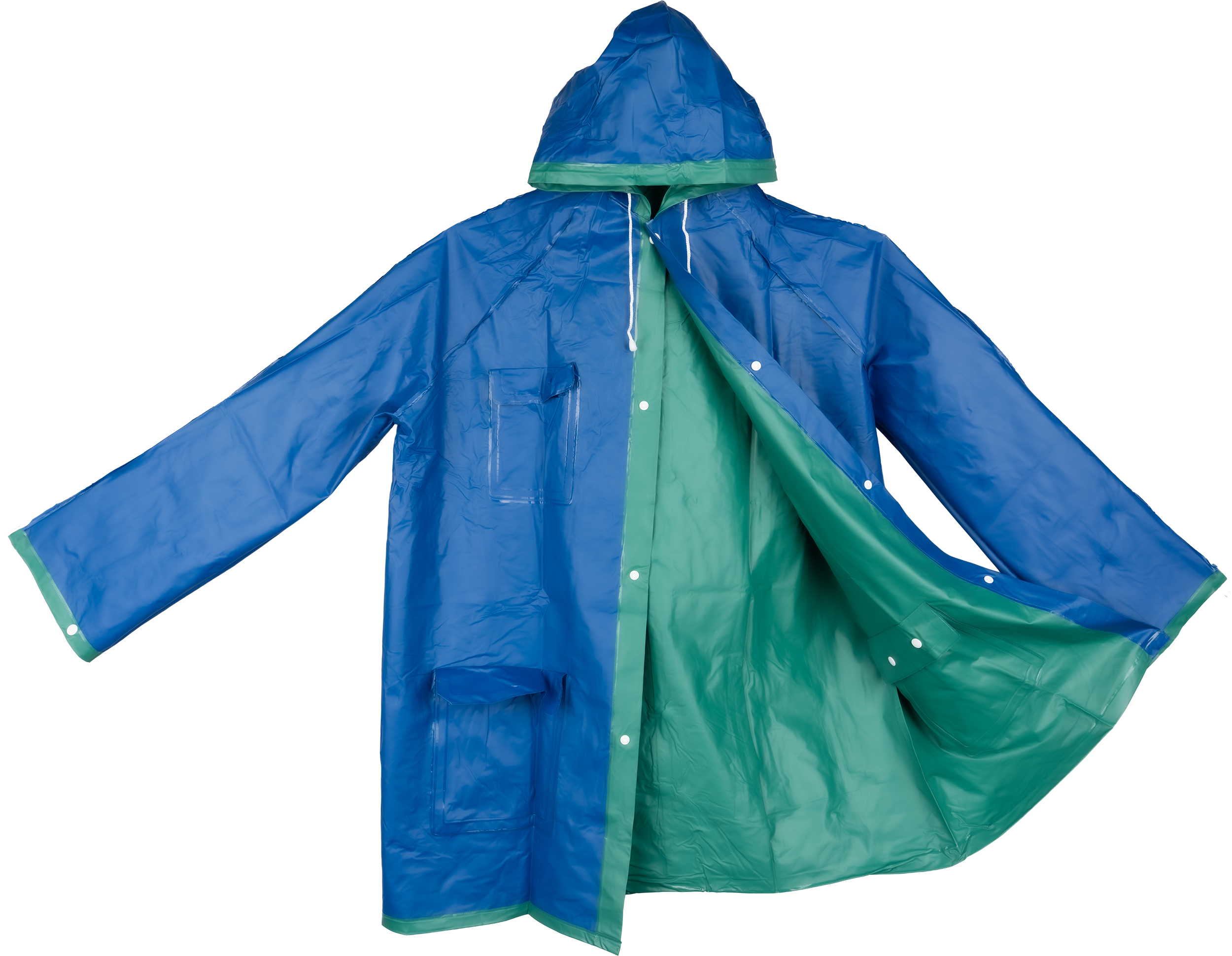 Reversible PVC rain jacket with hood, two pockets and press studs. Back of the coat - 103 x 60 cm.