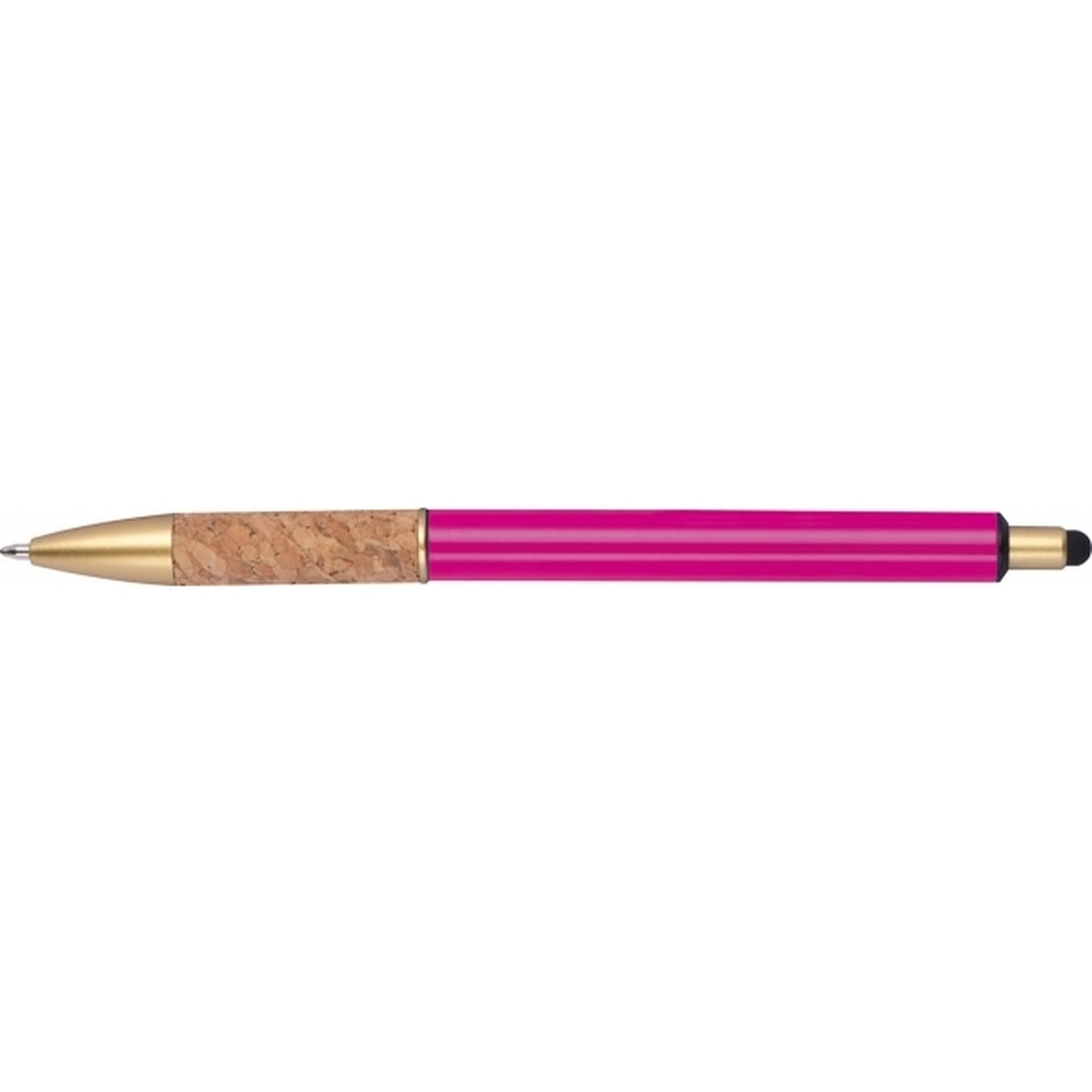 Metal ball pen with golden applications, blue-writing refill and cork grip zone. Your logo will be engraved to the right of the clip.