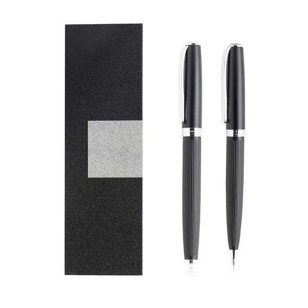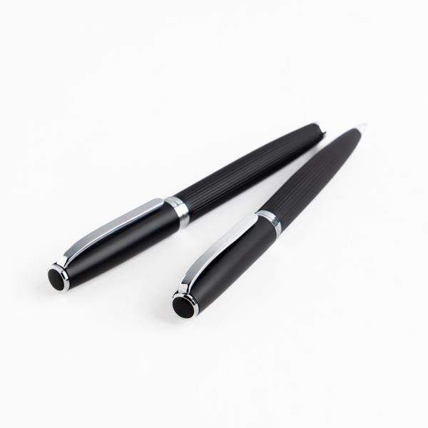 Set of roller and ballpoint in metal, gift box. A writing set with modern design, consisting of a ballpoint pen and a textured body roller and a cushioned box with an outer plate, for a more current look. This black writing set is a great engraving and offering option._x000D_