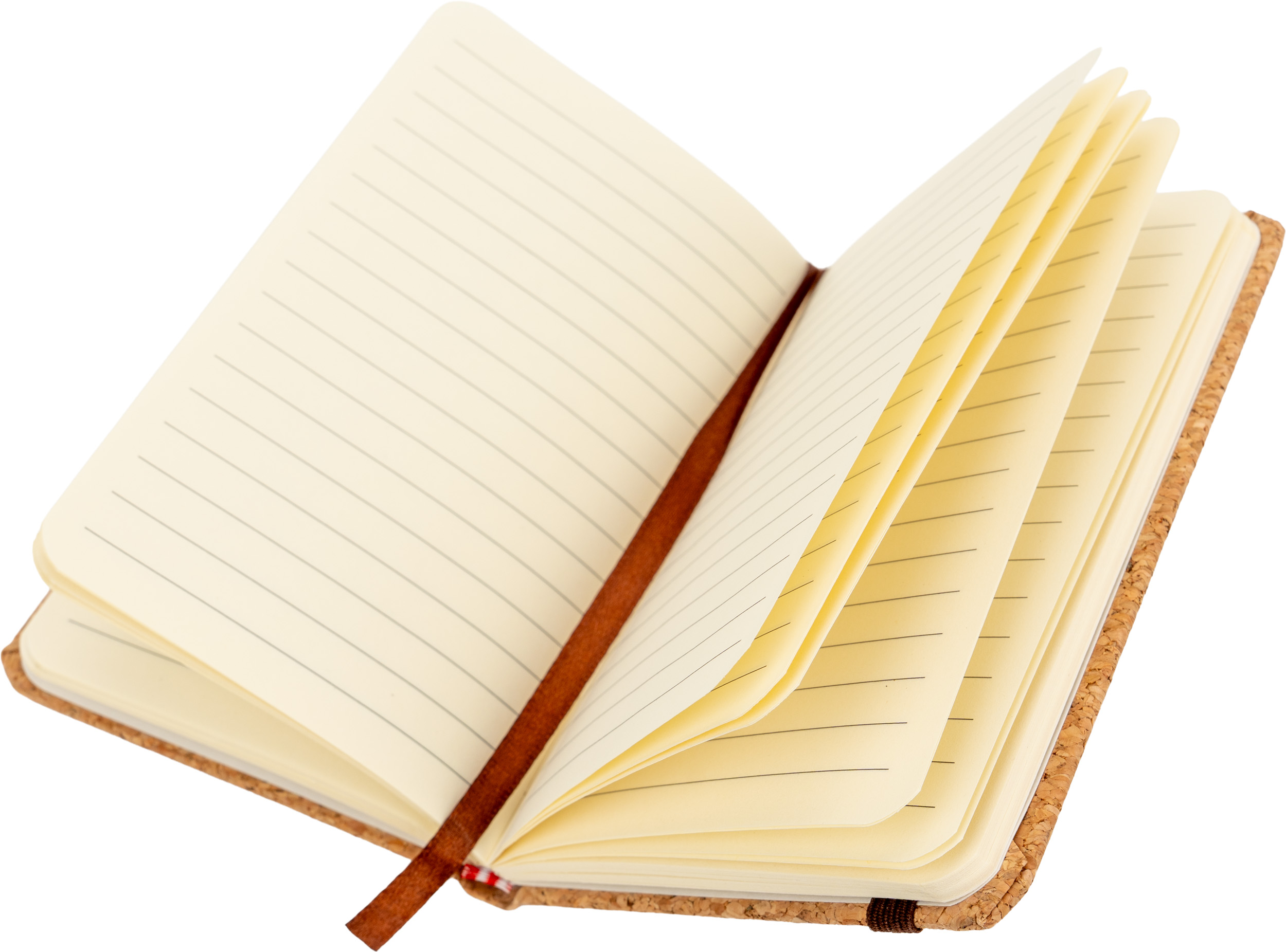 Notebook DIN A6 en liège, 80 pages lignées, signet et élastique pour fermer. On peut imprimer votre logo sur la couverture devant.